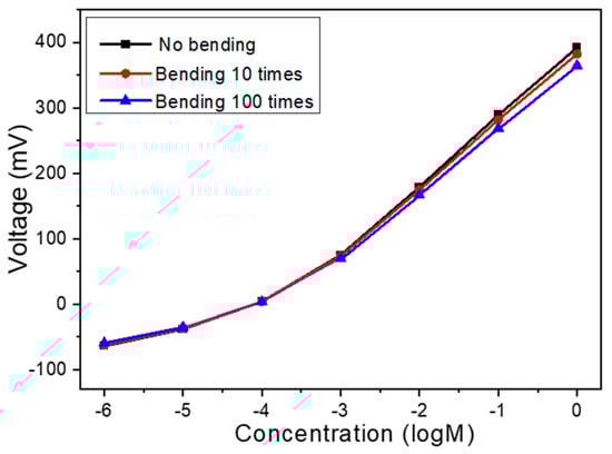 To evaluate the mechanical durability and morphological stability of the Na+ ion sensor under repeated mechanical deformation, bending tests were carried out using the flexible PET-based sensor integrated with 8 mg of MWCNTs in the sensing film. The ion-selective membrane, composed primarily of PVC with tert-butyl calix[4]arene tetraethyl acetate as the Na+ carrier and a plasticizer for enhanced film flexibility, was specifically engineered to adapt to flexible substrates. The incorporation of MWCNTs served to reinforce the polymer matrix, forming an interpenetrating network that not only improved electrical conductivity but also significantly enhanced mechanical integrity by distributing stress during deformation. As the results in Figure 7 show, after 10 bending cycles, the sensor maintained approximately 97.5% of its original signal response, and even after 100 cycles, it retained around 94.0%, demonstrating excellent functional stability. Furthermore, post-bending microscopic inspection confirmed that the electrode structure exhibited no visible signs of mechanical damage, such as cracking, delamination, or warping, indicating high morphological stability. This robustness can be attributed to the synergistic effect of the plasticized PVC matrix and the embedded MWCNTs, which collectively endow the film with high flexibility and resilience to repeated mechanical strain. These findings confirm that the sensor is not only functionally reliable under mechanical stress but also structurally stable, thus making it highly suitable for integration into flexible and wearable sensing platforms.