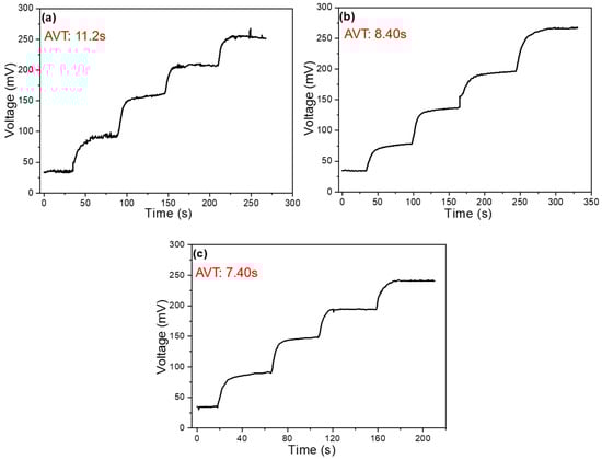 The addition of MWCNTs significantly enhances the detection of Na+ ions, so we focused on the analysis of response time under conditions with MWCNTs. These data are also an important indicator of the performance of ion-selective electrodes. Figure 8a shows the voltage-time relationship under conditions without the addition of MWCNTs, where the concentration changes over time. NaCl is added at intervals to alter the concentration. When observing the voltage change with respect to concentration over time, we see that the response time decreases as the concentration increases. The concentration changes as follows: 10−2 → 3 × 10−2 → 10−1 → 3 × 10−1 → 1 M, and the response time is measured from the moment NaCl is added until the voltage stabilizes. The average response time was calculated to be 11.2 s. Under the conditions with MWCNTs, the response time is faster at higher concentrations. With 4 mg of MWCNTs (as shown in Figure 8b), the average response time is 8.4 s, while with 8 mg of MWCNTs (as shown in Figure 8c), the average response time is 7.4 s. It is clear that the more MWCNTs are added, the faster the response time. Additionally, from Figure 8a, we can observe that the voltage is unstable at different concentrations without MWCNTs, but after the addition of MWCNTs, the voltage becomes stable without any fluctuations. Therefore, it can be concluded that adding MWCNTs improves the stability of the open-circuit voltage measurement.
