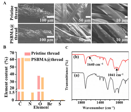 Characterization of threads. (A) SEM images of pristine threads and PSBMA@threads. (B) EDS quantified elemental content of threads. (C) FTIR Spectra of pristine threads (a) and PSBMA@threads (b).