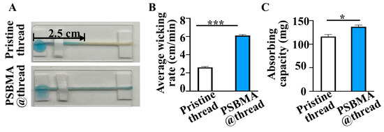 Flow characters of PSBMA@threads. (A) Comparison of liquid flow along a 5 cm length of pristine threads versus PSBMA@threads. Average wicking rate (B) and absorbing capacity (C) of pristine threads and PSBMA@threads (n = 3), * p < 0.05, *** p < 0.005.