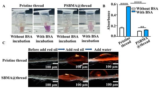 Protein repelling and underwater oleophobicity of PSBMA@threads. (A) Visual comparison of protein (BSA) adsorption resistance on pristine threads and PSBMA@threads using the BCA assay. (B) Quantitative analysis of protein absorbance on pristine threads and PSBMA@threads (n = 3) ** p < 0.01, **** p < 0.001. (C) Underwater oleophobicity of pristine threads and PSBMA@threads.