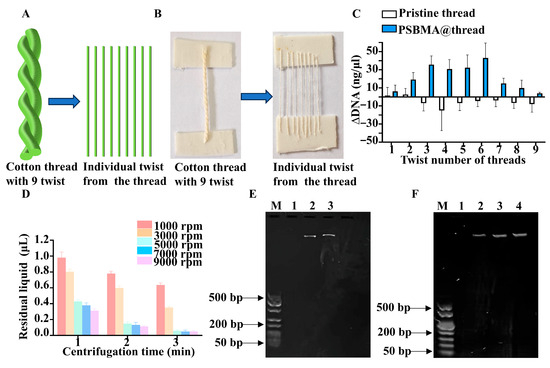 Efficient solid–liquid separation is a crucial step in solid-phase extraction workflows to ensure high-purity DNA recovery. Centrifugation parameters were optimized to achieve complete separation of the PSBMA@threads from the surrounding liquid. Experimental data indicated that centrifugation at speeds of ≥5000 rpm for durations of ≥3 min consistently resulted in residual liquid volumes of less than 0.05 μL per thread (1 cm) (Figure 4D). Lower speeds or shorter durations led to incomplete separation, which could potentially contaminate downstream analyses. Therefore, for the subsequent DNA extraction experiment, centrifugation speed of 5000 rpm for a duration of 3 min were used.