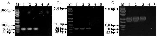 Characterization of PCR products using gel electrophoresis. (A) GAPDH gene from human prostate cancer cell DU 145 amplified from DNA extracted from 1 × 106 DU 145 cells using PSBMA@threads (lane 1), 1 × 106 DU 145 cells using commercial silica membrane nucleic acid purification column (ane 2), 1 × 105 DU 145 cells using PSBMA@thread (lane 3), and 1 × 105 DU 145 cells using a silica membrane nucleic acid purification column (lane 4). Lane 5 is negative control. (B) GAPDH gene from murine breast cancer cell EMT-6 amplified from DNA extracted from 1 × 106 EMT-6 cells using PSBMA@threads (lane 1), 1 × 106 EMT-6 cells using commercial silica membrane nucleic acid purification column (lane 2), 1 × 105 EMT-6 cells using PSBMA@thread (lane 3), and 1 × 105 EMT-6 cells using a silica membrane nucleic acid purification column (lane 4). Lane 5 is negative control. (C) Electrophoresis image of CDH1 gene amplified from DU 145 cells. The DNA templates used in each lane are the same as those in (A).