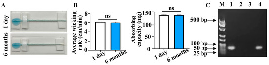 Stability of PSBMA@threads. (A) Comparison of liquid flow along a 5.0 cm length of PSBMA@threads stored for 1 day and 6-month. (B) Average wicking rate and absorbing capacity of PSBMA@threads stored for 1 day and 6-month (n = 3, ns: non-significant). (C) Agarose gel electrophoresis of GAPDH amplified from DNA extracted by different matrix, lane 1-six-month-stored PSBMA@threads, 2-pristine thread, 3-blank control, and 4-DNA extracted by commercial kit.
