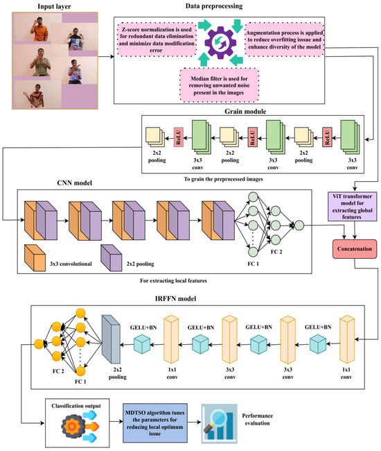 The CViT framework, which consists of two blocks—the CNN and ViT transformer—is then used for feature extraction. Only local characteristics of the grained model are retrieved by the CNN model, and only global features are extracted by the ViT transformer. The feature representation is created through the means of concatenating these local as well as global features integrated through a concatenation block. The feature map that has been created is then sent to the classification stage. The stage of classification provides results from the multi-class classification, while the IRFFN model creates the variable sign language terms derived based on the activation map at this point. The TSO algorithm is implemented to overcome the local optimum challenge and fine-tune CViT model parameters during the training phase. To address this issue, the TSO algorithm uses the mutation operator, and the ATSO algorithm is added to achieve the best possible output.
