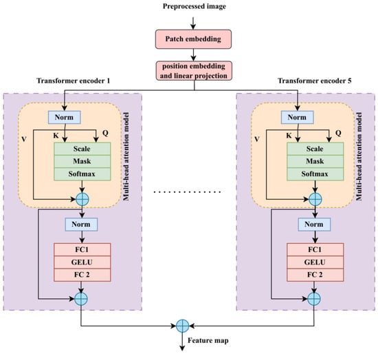 The preprocessed images are used as input for a transformer model’s patch embedding in order to extract global features. The input images are divided into patches of uniform size during this patch embedding step. Here, the terms such as H, , and and height, width, and the respective channel numbers. The following formula is applied to determine how many patches are used in the transformer model: