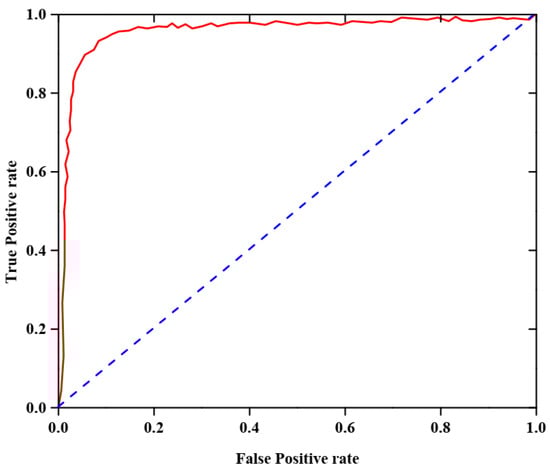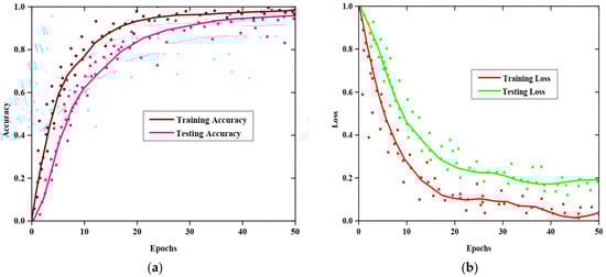 Figure 3a,b display the accuracy and error rates derived from the suggested approach during training and validation stages. In this case, with more epochs, the accuracy level rises and the error value falls. The suggested approach obtained training and testing accuracies which were observed to be 0.9658 and 0.9488 at epoch 50, as shown in Figure 3. Additionally, the suggested method’s training and testing losses at the 50th epoch are 0.04 and 0.19, respectively, in Figure 3b. To put it another way, those numbers demonstrate that the suggested approach achieved both enhanced accuracy and reduced loss.