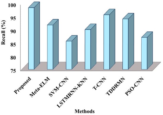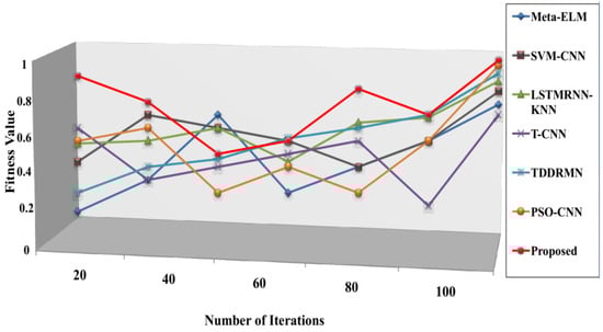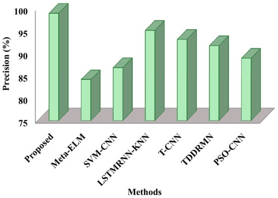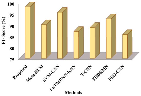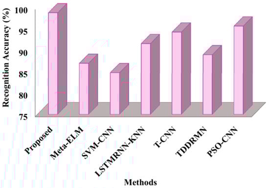 The suggested approach is contrasted with cutting-edge techniques like Meta-ELM [], SVM-CNN [], LSTMRNN-KNN [], T-CNN [], TDDRMN [], and PSO-CNN [] in this subsection. Below is a detailed description of the comparative study’s findings.
