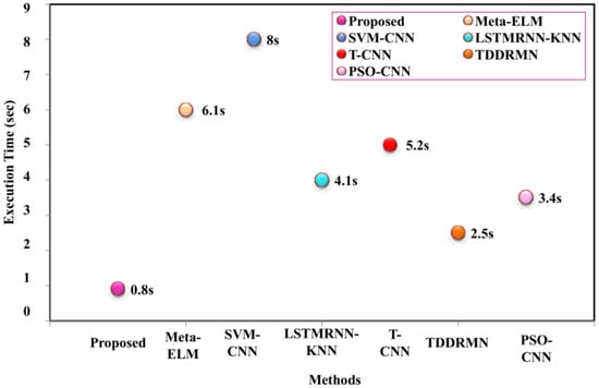 The comparison runtime analysis, which is the amount of time needed for the method to finish running, is shown in Figure 9. A shorter execution time indicates that the method is more efficient. Figure 10 illustrates that the proposed method takes 0.8 s to execute, compared to Meta-ELM 6.1, SVM-CNN 8, LSTMRNN-KNN 4.1, T-CNN 5.2, TDDRMN 2.5, and PSO-CNN 3.4 s, respectively.