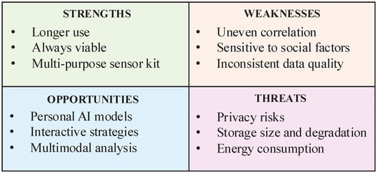 The distinctive feature of our work is its focus on the positive healthcare applications of smart monitoring. While a few other SWOT analyses have examined smartphone-based passive monitoring in general terms or in other domains, ours is, to the best of our knowledge, the first to provide an overview of the use of smartphone data in mHealth (other works consider smartphones as a cloud bridge or interface for external medical devices) for diagnostic and prognostic goals. Our decision to use a SWOT analysis was made after considering several different methodologies with a similar scope []. However, some of them seem too related to internal factors (e.g., SOAR [] and NOISE []), too close to strategic choices that can be conducted in actual business plans (e.g., SCORE []), or too focused on the analysis of competitors (e.g., Five Forces []). Consequently, we considered the SWOT analysis—with its clear presentation of internal and external factors as positive or negative—as the most balanced and appropriate tool for introducing a holistic discussion on evolving technological innovations, encompassing perspectives moving between academia and industry (as demonstrated in similar studies in the literature) [].