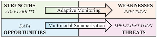 Concerning Q2 on necessary advancements, data privacy and storage threats must be addressed directly with a solution that enables consistently better and more reliable results. One possible solution lies in multi-sensor analysis, which could eliminate the need to store individual sensor data (either on devices or in the cloud). This solution involves multimodal summarisation, which combines multi-sensor analysis with the selective retention of only those data vectors that are significant for a given monitoring task. Similarly, weaknesses related to precision should be addressed by building solutions based on the adaptability of smartphones. Specifically, smartphones offer a unique opportunity to implement a hybrid approach that complements passive monitoring with ad hoc user engagement to fill data gaps and ground the analysis in user insights (adaptive monitoring). What emerges is a two-fold strategy (summarised in Figure 3) that uses strengths and opportunities to overcome the evident weaknesses and threats to smartphone-based passive monitoring.