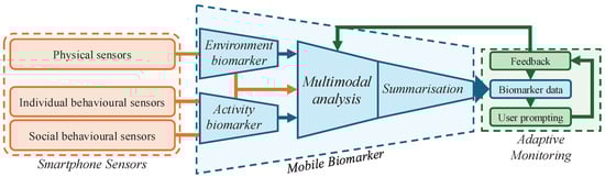 The general architecture of a mobile biomarker is compositional and should include environmental and activity analysis, bespoke multimodal analysis of smartphone sensors, and summarisation. Biomarker data are then embedded into an interactive monitoring system, which prompts users to ground or correct data when necessary and improve the analysis through a user feedback loop.