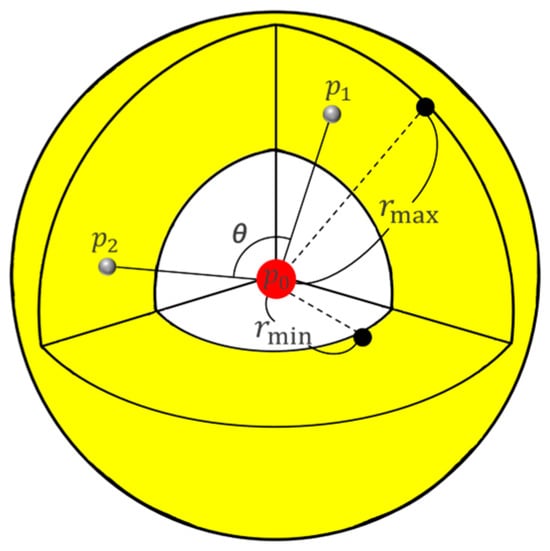 The main problem this paper addresses is how to determine the type of quantity that should be represented in histograms for effective classification, alongside an efficient and robust computational process. To this end, we propose the use of simple angular values between any pair of three-dimensional points, and centered around a nodal point, . Each point has three-dimensional coordinates contaminated by independently and identically distributed random noise and is selected from point cloud data (PCD). Points should be chosen to have relatively longer lengths in both arms to better capture essential characteristics of part shapes, such as stems, knots, and leaves. We assume these coordinates are disturbed by normally distributed noise with zero mean and variance originating from the 3D measurement process. Figure 1 illustrates a conditional selection of a tuple around a center of interest , where both elements lie in the gap or shell between two spheres of the radii and .