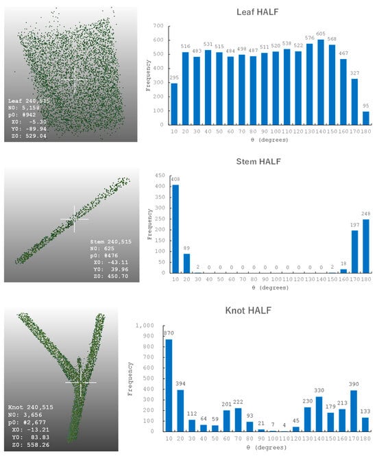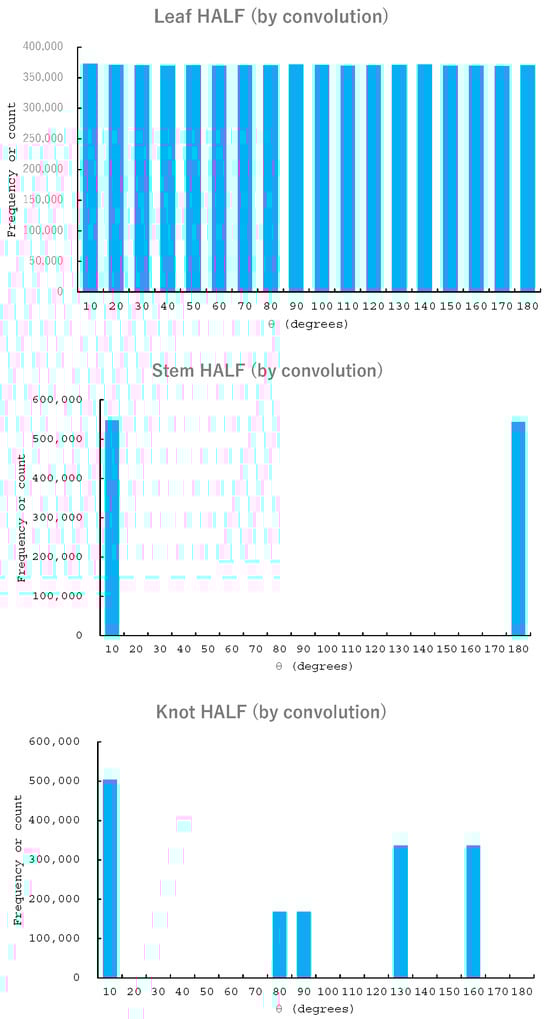 Figure 6 presents clear profiles of histograms for three classes of plant parts: leaf, stem, and knot, created through the previously mentioned mathematical formalization. The histogram for the leaf class shows a uniform distribution, while the stem class exhibits a bi-modal histogram. The histogram for the knot class features multiple peaks, in this case four, with one peak splitting into two due to trivial numerical quantization around 80 or 90 degrees.