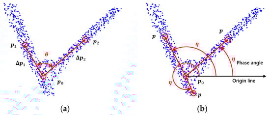 Let us formalize the aforementioned concept. Figure 4a illustrates the definition of an interest point, a pair of selected points, and the angle between two vectors for a typical knot data set. This pair establishes the intersection angle for HALF analysis. In Figure 4b the same angle can be represented as the difference between two phase angles . A histogram of the phase angles is represented as follows: