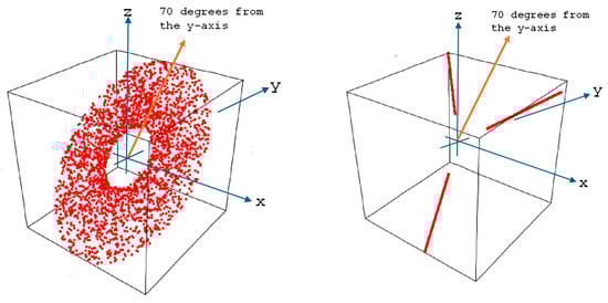 Figure 5 shows two sets of simulation data for convolution-based HALF calculation, each of which lies on a plane and on lines to validate the aforementioned prospect through mathematical convolution. These sets are inclined at an angle of 70 degrees from the y-axis. A critical aspect of this prospect is to neglect the thickness of any real objects. In the data, each point has its phase angle measured from the origin line for calculating the fundamental histogram of phase angles.