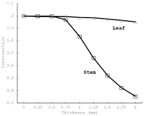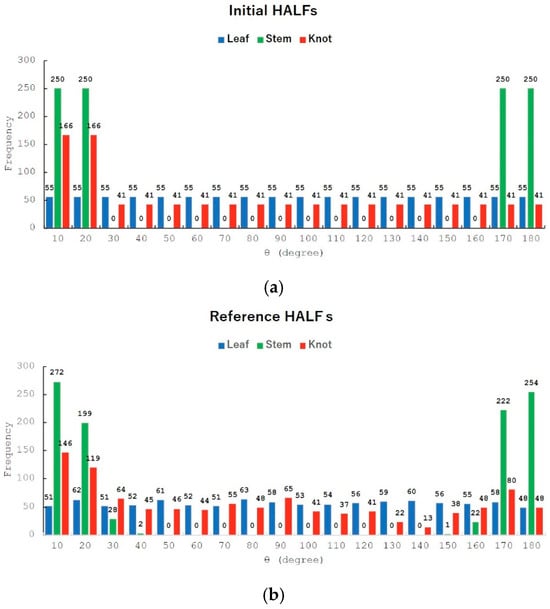 To design effective discrimination or classification methods, an effective similarity measure based on HALF is essential. The intersection is utilized to obtain a simple similarity between any two histograms of the same size, which can prove to be an effective approach [23,24]. In the aforementioned HALF analysis, any HALF is represented as a -tuple of ordered positive integers or real numbers, . In this paper, we define three classes of plant parts: leaf, stem, and knot, each with its own reference HALF, . For each pair of , the intersection is defined as follows: