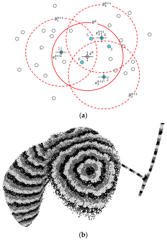 Figure 9a shows a snapshot at the k + 1st iteration of Bubble-based Selection Algorithm (BSA) used in sequential extensive merging, where a bubble radius , centered at the segmented point from the previous iteration, , is utilized to enclose PCDs for segmentation. The point is classified into the best class according to the current reference HALFs at that point in time. In this example, six points colored blue are labeled as belonging to the same class as and are then sorted by their distances from . Initially, after defining or segmenting as , a new bubble is created around it. Next, since is not included in and there are not enough segmented points yet, this defines the next segmented point and creates a new bubble . The points , , and do not contribute to segmentation because they are involved in or Lastly, satisfies the condition to be considered a new segmented point . In this experiment, we set a limitation on extending new segmentation to just four points surrounding Figure 9b illustrates a small-scale real example of SCSA processing. Notably, the uniform extension of bubbles for two classes—leaves and stems—was maintained throughout the SCSA process.