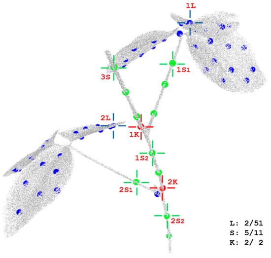 Figure 10 represents a set of candidate seed points defined in Step 1 of the SCSA, consisting of 51, 11, and two candidate seed points for the three classes. The red points indicate the round number of phytomer segmentation and the corresponding class ID. The SPs, S1 and S2, represent the upper and lower stem seeds, respectively.