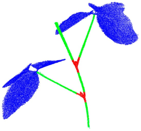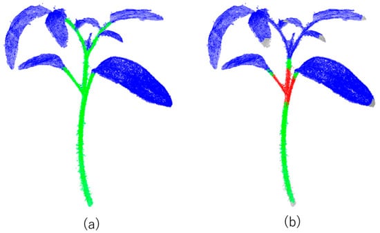 The segmentation performance of the SCSA was evaluated by comparing it with the ground-truth segmentation. Figure 12 shows the ground-truth segmentation, which was created by manually labeling each point in each class as either a leaf, a stem, or a knot. Table 2 presents the total number of point clouds in the ground truth, as well as the number of point clouds in each class. Determining the boundary between the knot and the stem is challenging when labeling the ground truth. Therefore, the center of the knot was manually specified, and a group of points within a sphere with a radius five times the stem diameter was classified as a knot. This setting also classifies the stipules as knots.