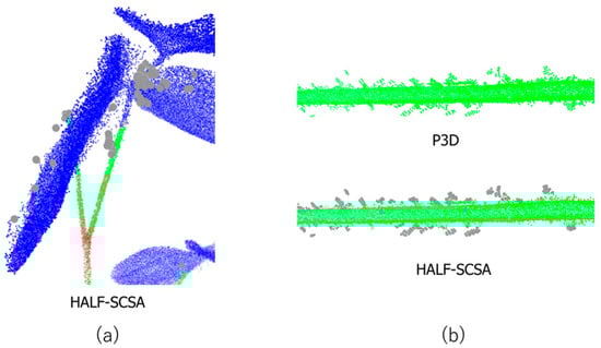 Furthermore, we also investigated how the proposed method handles noise (including outliers), which is a common and significant issue in plant phenotyping. Figure 14 shows regions in the soybean and tomato datasets where noisy points were observed. In (a), HALF-SCSA treats outliers as unclassified (gray) points which are visually enhanced for clarity. In (b), HALF-SCSA excludes noisy points by labeling them as unclassified, whereas P3D assigns all points to the stem class. This behavior is attributed to the design of the SCSA, which locally evaluates spatial continuity and avoids assigning unreliable labels to ambiguous points, thereby reducing misclassification. Although this evaluation is qualitative, it demonstrates that the proposed method exhibits a certain degree of robustness to real-world noise.