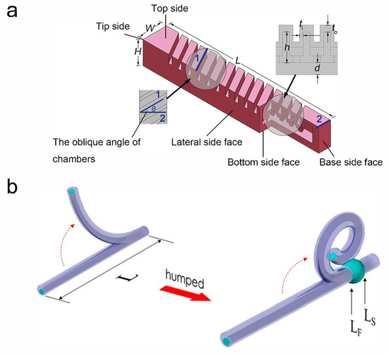 (a) The structure of a pneu-net actuator with oblique chambers (Edge 1 represents the inclined side of the actuator cavity, edge 2 represents the width side of the actuator, and edges 1 and 2 form the cavity angle) [38]. (b) A schematic diagram of PDMS microtube tentacle actuator. Unlike the plain microtube (left), the one shape-engineered with a hump (right) can produce a tentacle-like spiraling motion. Fabrication steps can be found in [39].