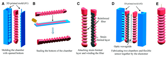 Typical fabrication steps of the soft actuator, structure of the optical waveguide and freely continue bending deformation of the soft actuator. (A) Fabricating the open chamber with a sinusoidal shape. (B) Closing the open side of the chamber with an elastomer sheet. (C) Attaching the strain limited layer and winding the reinforced fiber. (D) Encapsulating the two fiber-reinforced chambers and flexible sensor together. (E) The final soft actuator with bidirectional bending ability [49].