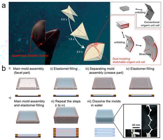 (a) Morphing principle of the pelican eel interpreted by the stretchable forms of origami fish base. Red lines indicate the pelican eel’s stretchable and foldable frames. Attached: concept of bioinspired dual-morphing stretchable origami in comparison with conventional origami [66]. (b) Fabrication of dual-morphing stretchable origami. Repetitive steps of mold assembly and elastomer filling were conducted to build the architecture of C-channel origami units. A subsequent demolding process was carried out by dissolving the molds in water. The final origami architecture was not only deployable but also stretchable [66].