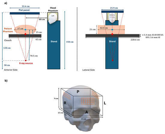 Representation of the experimental setup. (a) Anterior and lateral views of the interventional radiology setup reproduced during the experimental phase. (b) Reconstruction of the phantom used to simulate the absorbed dose to the operator’s meninges during interventional radiology procedures. The dosimeters measuring the entrance air kerma to the skull (orange) are positioned on the anterior (A), right (R), and left (L) sides of the operator’s head.