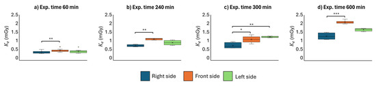 Entrance air kerma to the skull for the right, front, and left sides of the operator’s head, reported as a function of the exposure time: 60 (a), 240 (b), 300 (c), and 600 (d) minutes. Statistical differences for each time point are represented in terms of the p-value using a Kruskal–Wallis–Dunn test with the following notation: *, p < 0.05; **, p < 0.01; ***, p < 0.001. Non-significant differences are not reported. Relative uncertainties on Ke are ±15%.
