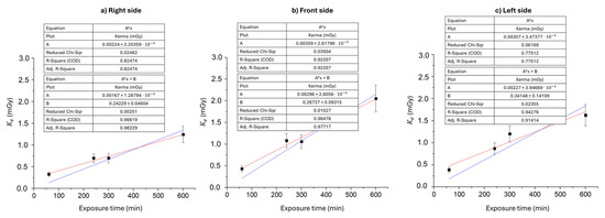 Entrance air kerma to the skull for the operator as a function of the exposure time (60, 240, 300, and 600 min) during the IR procedure. Kerma is evaluated for each side of the head: right (a), front (b), and left (c). Linear fit performed with zero intercept (blue) versus free intercept (red). Relative uncertainties on Ke are ±15%.