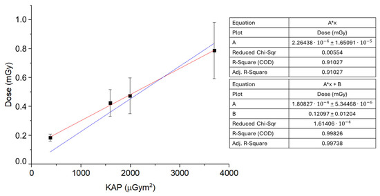 Finally, in Figure 6, an extrapolation of the mean absorbed dose (mGy) to the brain is obtained by averaging Ke (see Figure 5) for the right, front, and left sides of the operator’s head as a function of the KAP ), and considering the attenuation of the cranial bone reported by Ohno et al. [42]. The linear fit (y = Ax + B, R-Square > 0.95) returns , indicating a strong correlation between KAP and the estimated brain dose, demonstrating a strong correlation between KAP and the estimated brain dose.