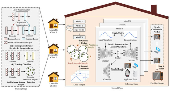 The proposed CBCDCL framework, depicted in Figure 2, comprises several key components. The initial phase involves local learning for clients with newly labeled data, incorporating four essential modules shown in the left panel: the encoder module, which converts raw input data into high-dimensional latent representations to enhance feature expressiveness; the decoder module, which reconstructs encoded features into input space for confidence assessment; the classification module, which generates appliance category predictions from encoded features; and the anomaly detection region, which identifies anomaly data in target clients to facilitate updates of client-side model portfolios. When new clients or data emerge, the client performs the described training process locally. Following local training completion, these module parameters are distributed to other clients within the NILM system. Recipient clients subsequently update their local model portfolios (central panel) by evaluating newly received models against a minimal-anomaly sample criterion—replacing existing models only when candidates demonstrate lower anomalies on local data. During appliance identification (right panel), all models within the client’s local model portfolio first generate decoded outputs (reconstructions) and classification outputs. The Euclidean distance between decoded outputs and raw inputs functions as a confidence metric, with classification results accepted only if this distance remains below a predefined threshold. When multiple valid outputs exist, multi-model voting determines the final prediction; if no outputs meet the threshold, all models contribute to the collective decision.