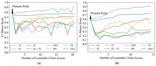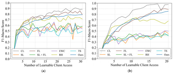 Performance evaluation of distributed continual learning methods under the same dataset. (a) PLAID dataset; (b) WHITED dataset.