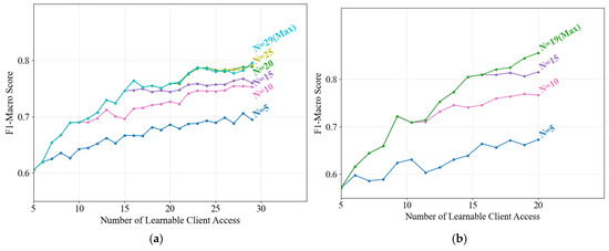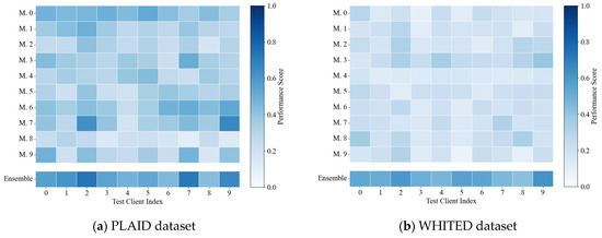 The identification performance shows consistent improvement longitudinally as learnable client models are incrementally incorporated, regardless of the preset N. This demonstrates the effectiveness of the proposed portfolio update strategy in selectively replacing existing models with superior alternatives to enhance local identification capabilities, thereby addressing NILM systems’ long-term operational requirements. Horizontally, higher model capacity limits correlate with improved final performance, albeit at the expense of increased storage and computational overhead. A balanced trade-off can be achieved by setting moderate N values—for instance, N = 20 for the PLAID dataset. Compared to retaining all models, this configuration reduces storage consumption by 31% while incurring only a 0.83% performance degradation, representing an acceptable compromise.