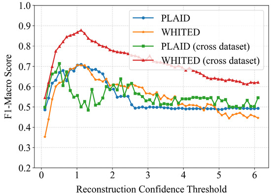 Further analysis revealed that under same-data-distribution conditions, both PLAID and WHITED datasets achieved optimal performance near threshold = 1. In cross-dataset scenarios, WHITED as the target dataset similarly showed peak performance around threshold = 1, while PLAID as the target dataset achieved optimal results near threshold = 0.5. Notably, the PLAID dataset exhibited more pronounced performance volatility during threshold adjustment. This suggests greater threshold sensitivity in cross-dataset applications involving PLAID, potentially due to its richer appliance diversity compared to WHITED. The pre-trained models from WHITED might inadequately represent PLAID’s complex feature space, leading to differentiated optimal thresholds. For practical implementation, we recommend obtaining optimal threshold settings through limited batch sample testing. Specifically, after users update their local model combinations, they should utilize a pre-annotated calibration dataset for testing to determine the optimal threshold for the current model ensemble.