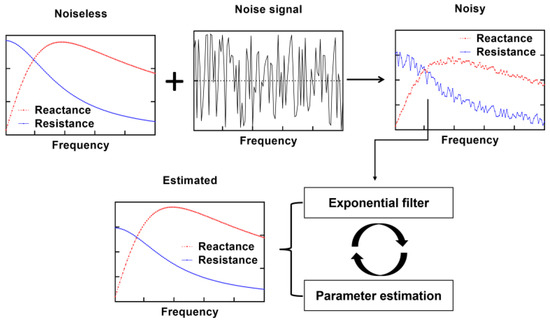 We utilized Equations (2) and (3) to generate synthetic values for the real and imaginary components of impedance using the randomly selected nominal values of model parameters. The noise level was controlled using the function for random number generation, rng. A general-purpose pseudorandom number generator, Mersenne Twister, was specified. Noisy impedance was filtered using the proposed method followed by the estimation without reference to the idealistic values (noiseless), as shown in Figure 2. The analysis based on the synthetic datasets was used to determine the impact of frequency distribution type (Section 3.2), noise impact on the estimation accuracy (Section 3.3), analysis of characteristic frequency impact (Section 3.4), to demonstrate how recursive filtering reduces the noise impact and how the estimation accuracy of previously published work is enhanced with filtering (Section 3.5), and reduced number of data points (Section 3.6).