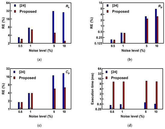 We first performed the comparison of the EIS data processing method presented in [24]. The dataset was created using the nominal values of model parameters (Rs = 220 Ω, Rp = 1 kΩ and Cp = 3.3 nF) and a frequency range from 1 kHz to 100 kHz (number of data points N = 100, with linear spacing). A comparison of the estimated values with the proposed method and previously reported [24] is summarized in Figure 3. Please note that the logarithmic scale was used on vertical axes in Figure 3. The proposed method in this work reduced the relative errors in estimated values for all noise levels. The benefits of the proposed method are evident, especially in cases with increased noise levels (5% and 10%). We also observed that estimation time (measured using built-in functions tic and toc) for both methods was consistent through the variations in noise levels, but that the proposed filtering increased estimation time by approximately 10 ms.