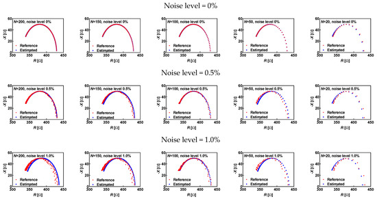 In the case of noiseless data (noise level 0%), estimated values in cases of N equal to 200, 100, and 50 are equal to the reference values. This was expected because there was no noise, and the actual characteristic frequency matched the frequency points in the dataset. However, that condition was not satisfied in cases of N = 150 and N = 20. Relative errors in characteristic frequency estimation equal 0.33% for N = 150 and 4.07% for N = 20. The impact of the higher error in the estimation of characteristic frequency can be seen in higher relative errors (0.59%, 0.08%, and 3.84%) for the estimation of model parameters (Rs = 328.04 Ω, Rp = 99.92 Ω and Cp = 49.37 nF) in the case of N = 20 when compared to relative errors (0.05%, 0.00% and 0.33%) and estimated values of model parameters (Rs = 330.16 Ω, Rp = 100.00 Ω and Cp = 51.51 nF) in the case of N = 150. The corresponding Nyquist plots are shown in Figure 4.