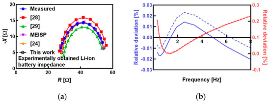 (a) Comparison of Nyquist plots for different fitting approaches [24,28,29], (b) comparison of relative deviations between the raw (solid) and estimated with the proposed method (dashed) resistance (blue colored) and reactance (red colored).