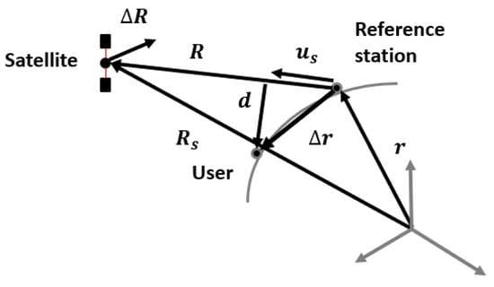 Referring to Figure 2, the difference between satellite position errors () depends on the geometry and can be derived as in [23]: a satellite ephemeris error, , causes a scalar ranging error E, that is, the projection of the satellite vector error on the direction given by the unit vector pointing the satellite from the user, :