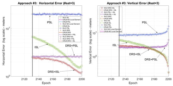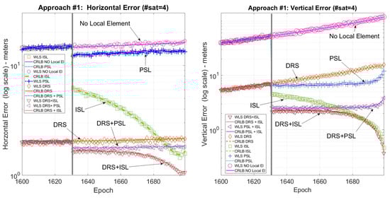In each figure, the vertical gray line shows the moment at which the PSL and the ISL start to be in view from the user, and the error is reported in log-scale to better distinguish the difference among the various methods. Finally, the local sensor configurations are as follows: only satellites (No local sensor), satellites plus pseudolite (PSL), satellites plus independent source of localization (ISL), satellites plus differential correction (DRS), satellites plus differential correction plus pseudolite (DRS+PSL), and satellites plus differential correction plus independent source of localization (DRS+ISL).