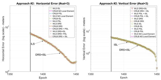 Figure 5 and Figure 6 show that when fewer than four satellites are visible, exploiting the ISL or the PLS solutions, it is still possible to solve the positioning problem. Moreover, ISL+DRS gives the best results, similar to the previous case, also when only one satellite is in visibility.
