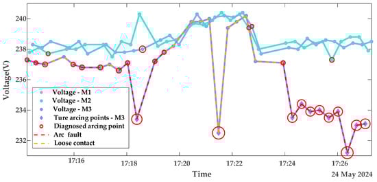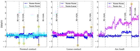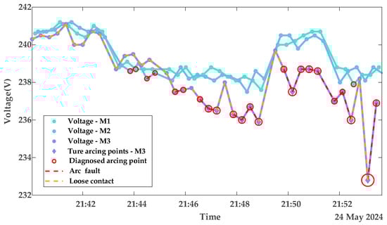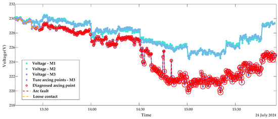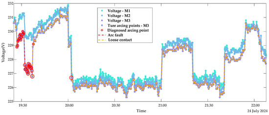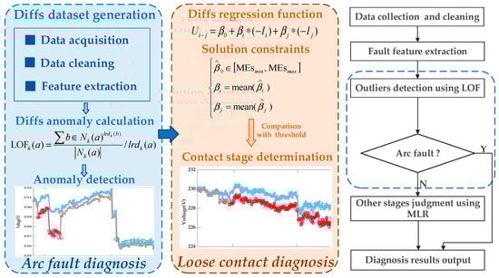 - Loose contact diagnosis: Based on the linear relationship between voltage drops, current, and contact resistance established in Formula (10), the MLR model calculates contact resistance for datasets devoid of arc faults. Loose contact diagnosis is achieved through comparative analysis against the predefined threshold.