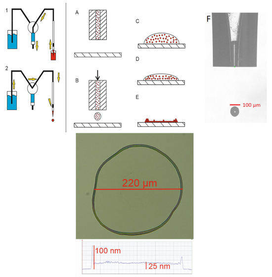 The deposition involves a pico-dispenser (Scenion, sciFLEXARRAYER S12, Berlin, Germany) and glass nozzles equipped with piezo actuators. This allows for accurate and repeatable placement of picolitre volumes of liquid droplets. Firstly, by creating negative pressure in the nozzle through movement of the syringe pump, the sample is aspirated into the nozzle (Figure 1(1)). After the pump stops, the system is prepared for dispensing liquid using a piezoelectric device mounted on the corpus of the nozzle (Figure 1(2)). Adjusting the actuating signal to the parameters of the substance results in a stable and reproducible droplet (Figure 1(F)). After centralizing the nozzle at 500 µm above a chosen substrate (Figure 1(A)), the actuating signal is applied, which produces hypertension ejecting droplets of substance (Figure 1(B)). NPs in the deposited material are spread evenly (Figure 1(C)). The drying process leads to NPs slowly drifting towards edges, where they form a ring-shaped structure (Figure 1(D,E)). This is called ‘the coffee-ring effect’ [12]. The flat-disc portion of deposited material has a thickness of 20 nm, whereas the ring structure is 100 nm to 120 nm thick. Measurements were conducted using the Stylus Profiler System (Bruker, DektakXT, Tucson, AZ, USA) with an error of 0.5 nm.