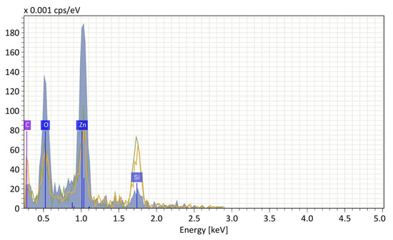 The tests were intended to assess the composition of the layer after the solvent evaporation was performed [13]. The ZnO—NP spots were deposited onto the silicon substrate [14,15]. SEM/EDS (energy dispersive spectroscopy) and AFM were used to evaluate the material’s quality and surface morphology (an average root mean square (RMS) roughness of the surface before deposition—0.2–0.4 nm). EDS measurements were conducted using EDAX Elite T EDS with FEI Nova™ NanoSEM 630 (EDS—AMETEK GmbH, Weiterstadt, Germany; NanoSEM—FEI Europe B.V., Eindhoven, The Netherlands) The obtained data suggest a material primarily composed of zinc oxide (Zn-1 keV, O-0.5 keV), with possible surface contamination or a carbonaceous matrix at 0.2 keV. The energy peak equal to 1.7 keV is a contribution of the silicon substrate. Figure 2 shows the energy pattern in the EDS spectrum.
