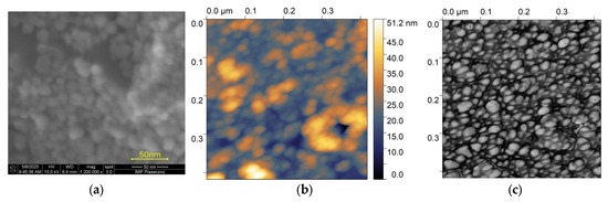 Topography image provided by (a) SEM and (b) AFM; (c) phase-shift diagram of the single-layer deposited ZnO nanoparticles, showing the surface morphology; the scan field is 400 nm × 400 nm and the median of grain size is 20.46 nm.