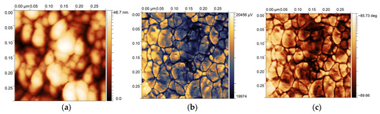 The multilayer ZnO—NP sample deposited on the silicon substrate covered with metal (20 nm Au, roughness 0.2–0.4 nm) was tested using the piezoresponse force microscopy (PFM) technique (Nanosurf FlexAFM C3000 equipment, Nanosurf AG Liestal, Switzerland) [16,17] (Figure 4). The conductive AFM probe (NanoWorld CONTPt, Neuchâtel, Switzerland) was brought into contact with the sample. The AC excitation voltage (6 V, 60 kHz) was applied between the tip and the sample. To reduce the impact of humidity variations, the measurements were performed atthe controllable lab conditions, i.e., at stabilized relative humidity of 30% and temperature of 22 ± 1 °C.