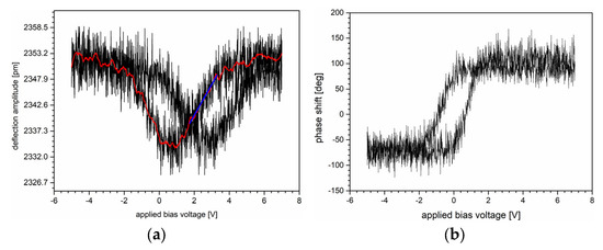 Based on the approach reported in [18], we estimated the effective electromechanical coefficient as a rate of the tip deflection and the applied bias voltage. The calculations were performed for the data range corresponding to the linear relationship between the tip deflection and the applied bias voltage marked by the blue straight line in Figure 5a. The estimated value amounted to 5.2 pm/V and refers to the slope of the tangent line.