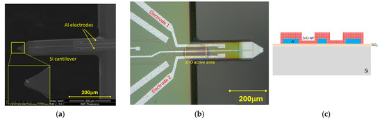 The ZnO—NP layer pico-dispensing was performed on the AFM cantilevers with a geometry applicable for dynamic modes (k ~3 N/m, frequency ~100 kHz, Q ~300). The probes, manufactured at the Institute of Microelectronics and Photonics (IMiF, Piaseczno, Poland), are equipped with planar aluminium electrodes and a 10 nm sharp silicon tip (Figure 6). Additionally, the probes are integrated with a piezoresistive deflection sensor, which was disconnected for the current experiment. The described experiment used a configuration that did not require an upper electrode. Despite the disadvantage of such a solution, which is a less well-defined capacitor, the main advantage is simplified manufacturing technology.